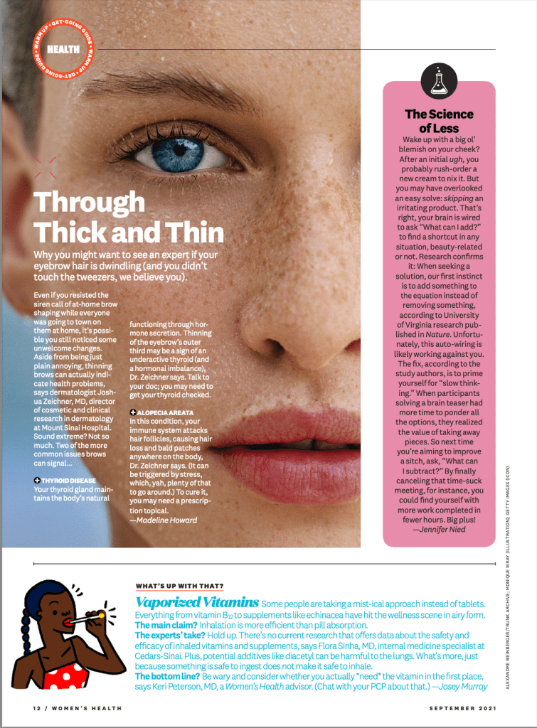 Wake up with a big ol’ blemish on your cheek? After an inital ugh, you probably rush-order a new cream to nix it. But you may have overlooked an easy solve: skipping an irritating product. That’s right ,your brain is wired to ask “What can I add?” to find a shortcut in any situation, beauty-related or not. Research confirms it: When seeking a solution our first instinct is to add something to the equation instead of removing something, according to University of Virginia research published in Nature. Unfortunately, this auto-wiring is likely working against you. The fix, according to the study authors, is to prime yourself for “slow thinking.” When participants solving a brain teaser had more time to ponder all the options, they realized the value of taking away pieces. So next time you’re aiming to improve a sitch, ask, “What can I subtract?” By finally cancelling that time-suck meeting, for instance, you could find yourself with more work completed in fewer hours. Big plus!