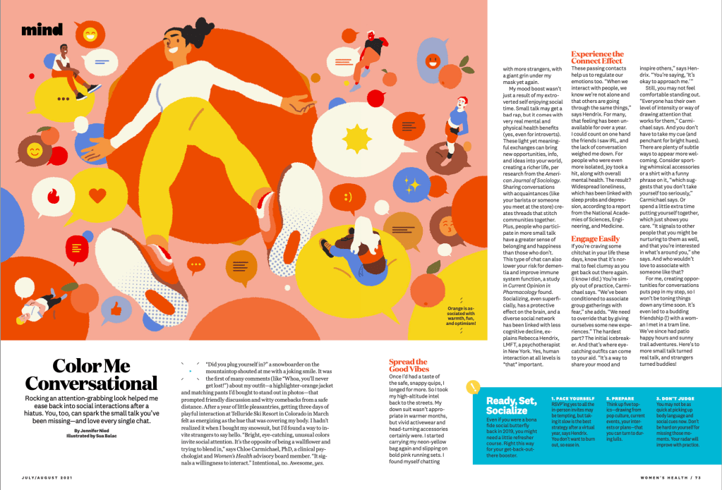 “Did you plug yourself in?” a snowboarder on the mountaintop shouted at me with a joking smile. It was the first of many comments (like “Whoa, you’ll never get lost!”) about my outfit—a highlighter-orange jacket and matching pants I’d bought to stand out in photos —that prompted friendly discussion and witty comebacks from a safe distance. After a year of little pleasantries, getting three days of playful interaction at Telluride Ski Resort in Colorado in March felt as energizing as the hue that was covering my body. I hadn’t realized it when I bought my snowsuit, but I’d found a way to invite strangers to say hello. “Bright, eye-catching, unusual colors invite social attention. It’s the opposite of being a wallflower and trying to blend in,” says Chloe Carmichael, PhD, a clinical psychologist and Women’s Health advisory board member. “It signals a willingness to interact.” Intentional, no. Awesome, yes...