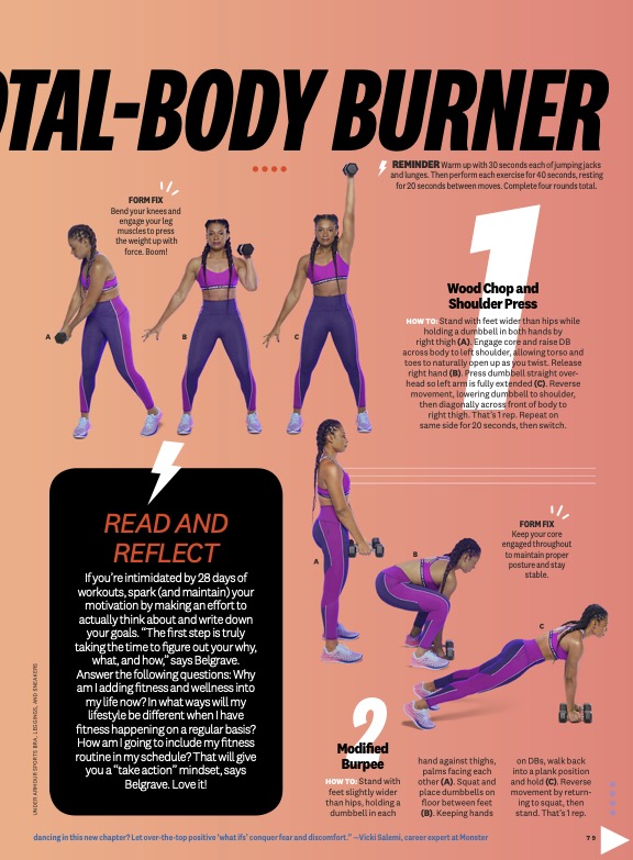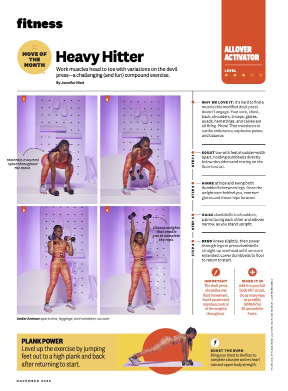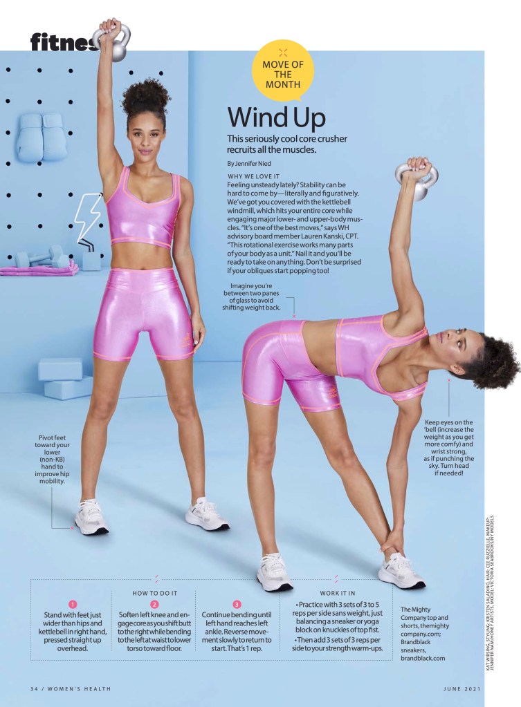 Why we love it: Feeling unsteady lately? Stability can be hard to come by—literally and figuratively. We’ve got you covered with the kettlebell windmill, which hits your entire core while engaging major lower- and upper-body muscles. “It’s one of the best moves,” says WH advisory board member Lauren Kanski, CPT. “This rotational exercise works many parts of your body as a unit.” Nail it and you’ll be ready to take on anything. Don’t be surprised if your obliques start popping too!