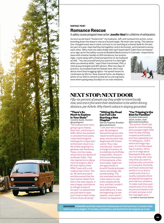 As soon as we heard “Avalanche!” my husband, Jeff, and I jumped into action, snowboarding down the slope to rescue a buried target. My heart was racing. This adrenaline-charged event was in stark contrast to our working at a shared desk for the better part of a year. Days had blurred together, and to be honest, we’d started to annoy each other. (Why must the table shake with each keystroke?) Cabin fever prompted us to sign up for the safety course at Bluebird Backcountry in Colorado. I expected to leave with a better handle on SOS situations, but surprisingly, I came away with a fresh perspective on my husband as well. “You see yourself and your partner in a new light when you develop skills,” says Chloe Carmichael, PhD, a clinical psychologist and WH advisor. After two days of practice, my husband had the fastest time. But it was about more than bragging rights—his speed meant he could save my life too. Now, back at home, we display a photo of our drill to remind us that we’re a strong team, even when typing away (loudly!) on our solo missions.